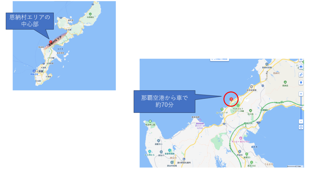 - 那覇空港 → 車で約60〜80分(交通状況次第)