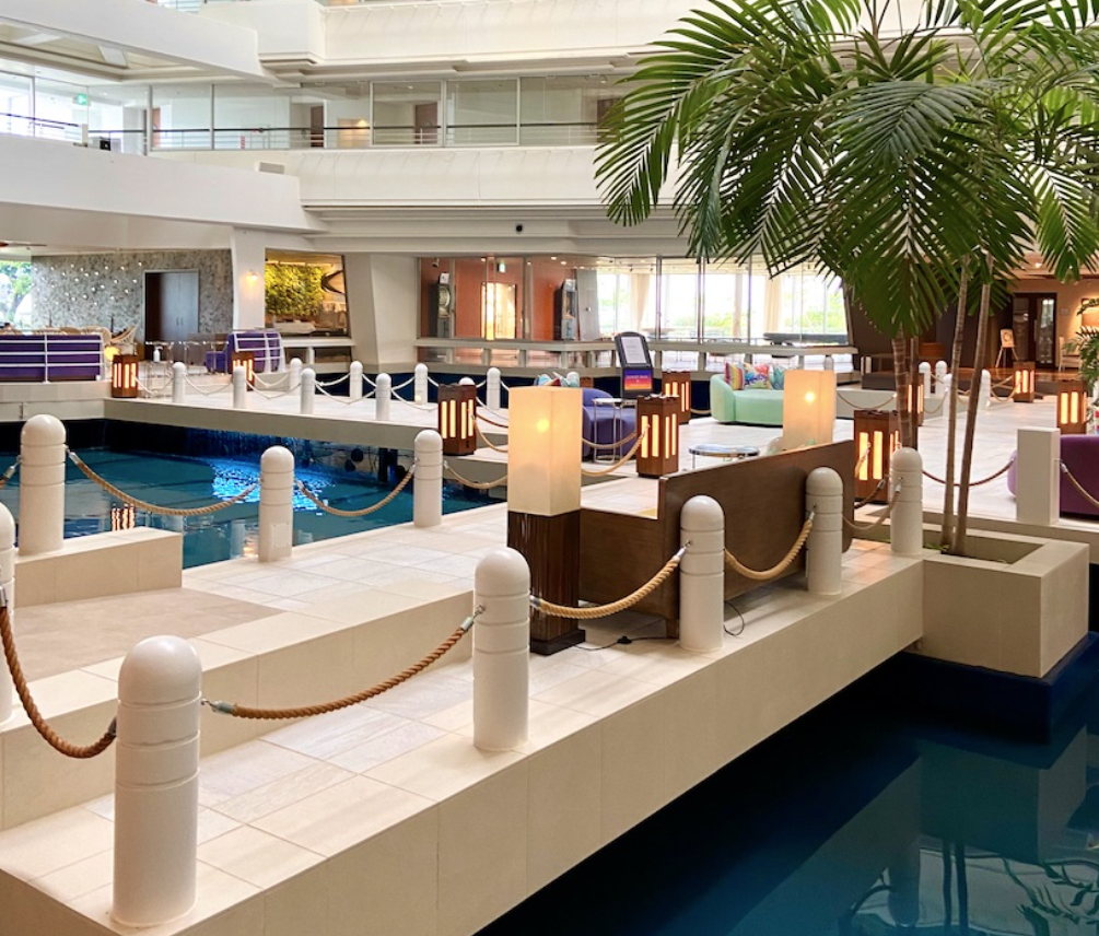 ホテル中央には、まるで“館内を流れる川”のような水景があり、岩やサンゴの間を魚たちが泳ぐ姿に、子どもたちは大喜び!