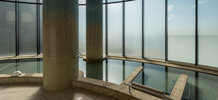 本館とは別棟(ウェルネス&スパ棟)に位置する大浴場は、東シナ海に沈む夕日を眺めながら入浴できる絶景スパです。