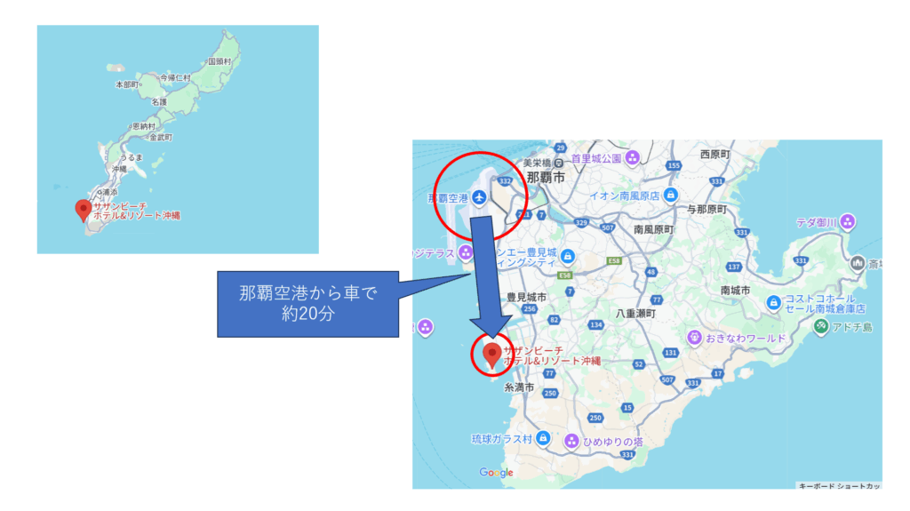 那覇空港から車で約15分、サザンビーチホテルからも約15分。