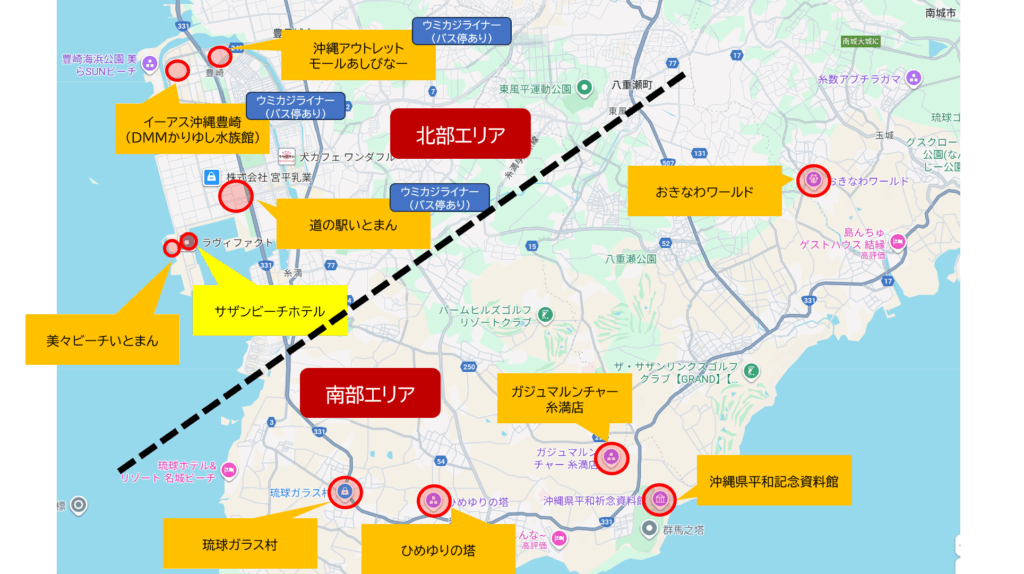 添付のマップのとおり、エリアとしては大きく 「北部エリア(ショッピング・屋内観光)」 と 「南部エリア(文化・歴史・自然体験)」 に分けて考えると動きやすくなります。