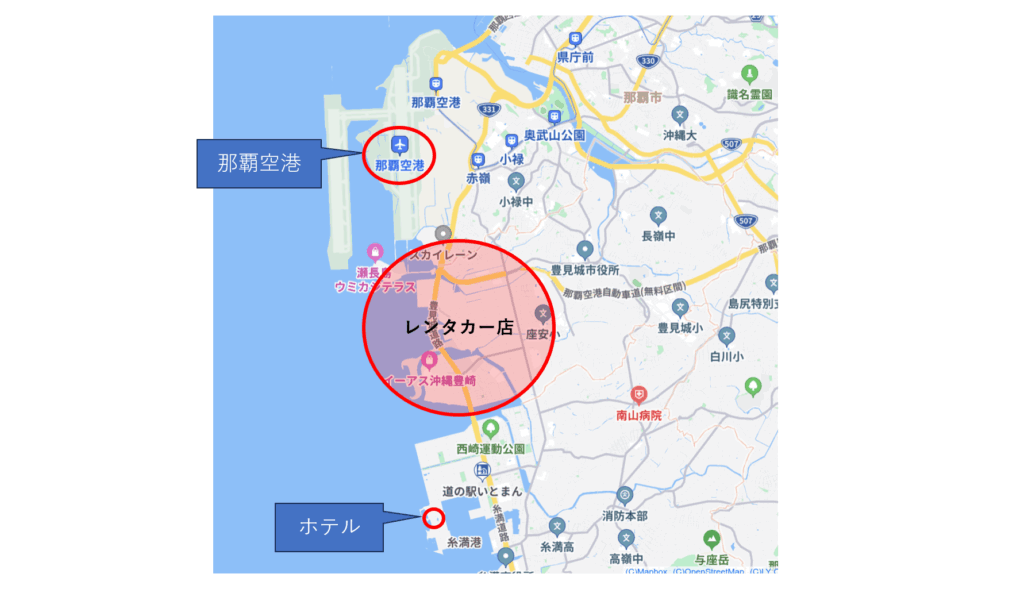 多くは、空港敷地内ではなく、南側の「レンタカー営業エリア」(糸満・豊崎エリア)でピックアップします。