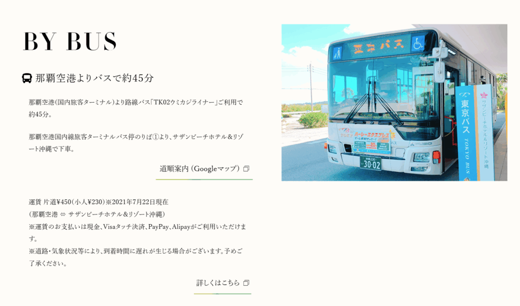 レンタカーを使わない場合は、那覇空港から出ている路線バス「TK02 ウミカジライナー」が便利です。